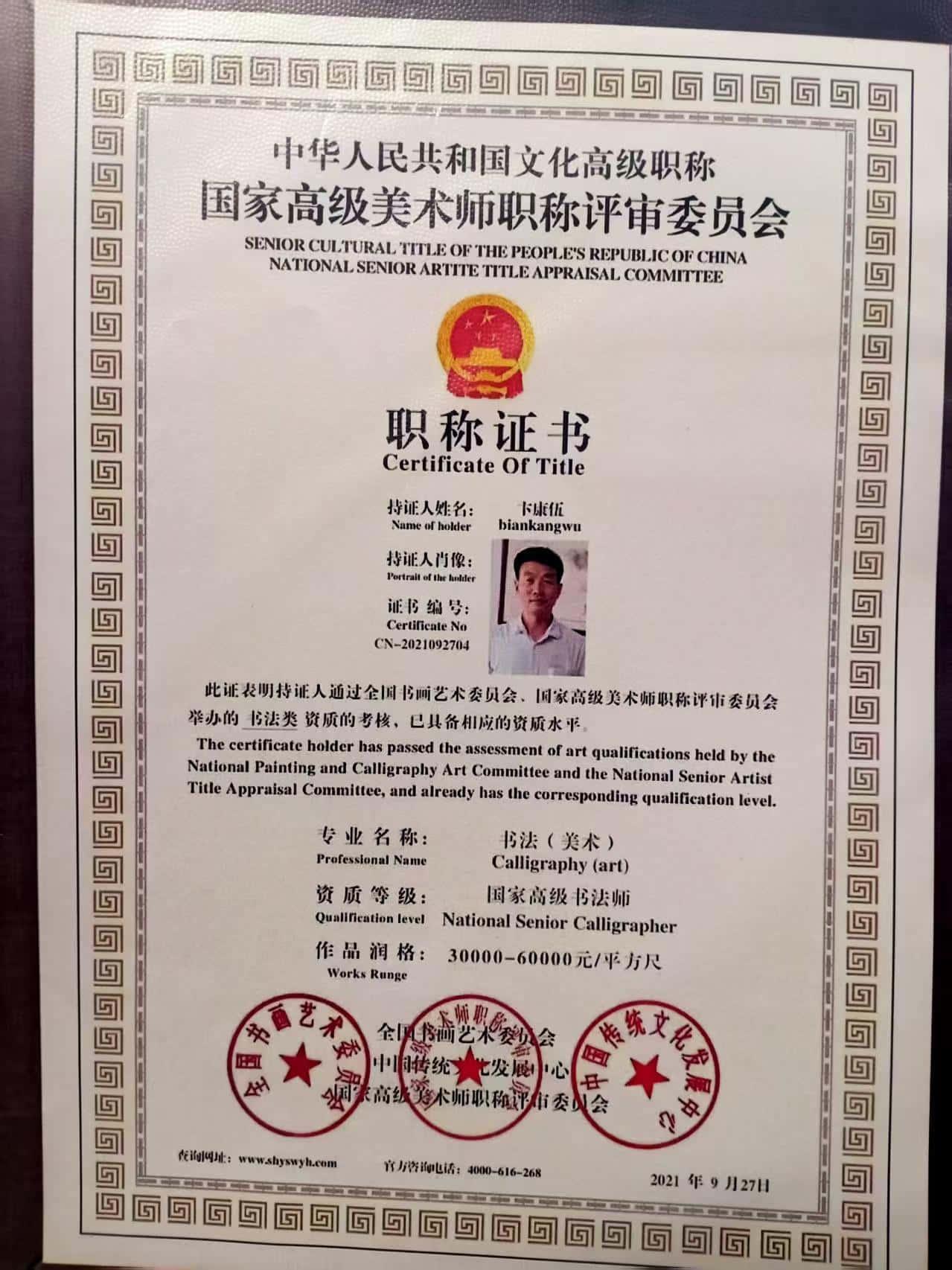 2019年10月20号特授予“国家级金奖艺术家”荣誉称号。