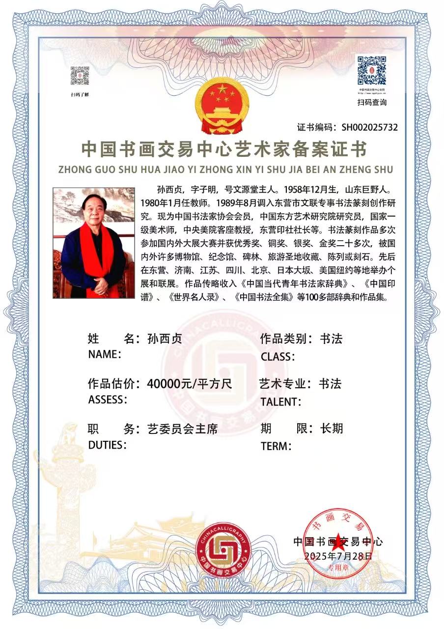 孙西贞,字子明,号文源堂主人。1958年12月生,山东巨野人。1980年1月任教师。1989年8月调入东营市文联专事书法篆刻创作研究。现为中国书法家协会会员,中国东方艺术研究院研究员,国家一级美术师,中央美院客座教授,东营印社社长等。书法篆刻作品多次参加国内外大展大赛并获优秀奖、铜奖、银奖、金奖二十多次,被国内外许多博物馆、纪念馆、碑林、旅游圣地收藏、陈列或刻石。先后在东营、济南、江苏、四川、北京、日本大坂、美国纽约等地举办个展和联展。作品传略收入《中国当代青年书法家辞典》、《中国印谱》、《世界名人录》、《中国书法全集》等100多部辞典和作品集。